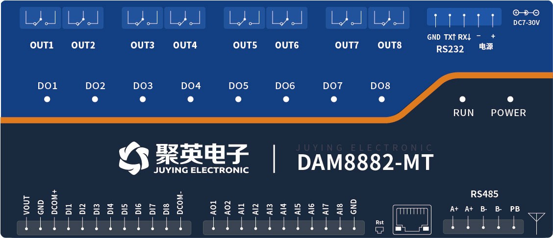 工業級繼電器控制板 8路繼電器控制(DO)8路開關量采集(DI)DAM8882-MT,8路繼電器控制輸出,觸點隔離;8路開關量輸入;支持RS232或隔離RS485通訊接口;標準Modbus協議,支持Modbus RTU/ASCII;支持點動輸出,聯動功能(輸入...