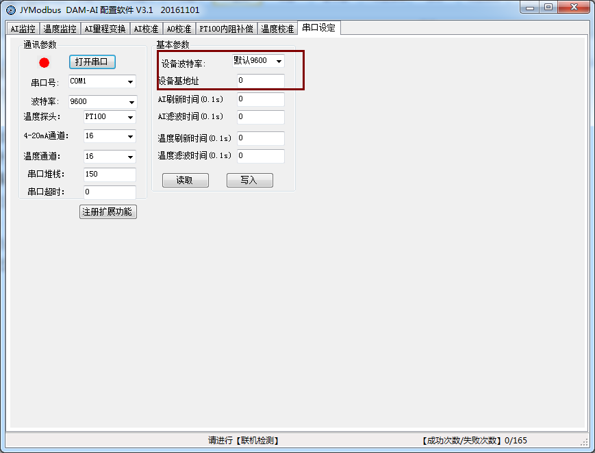 點(diǎn)擊下方波特率設(shè)置欄的“讀取”和“設(shè)置”就可以分別讀取和設(shè)置波特率和地址,操作后需要重啟設(shè)備和修改電腦串口設(shè)置。