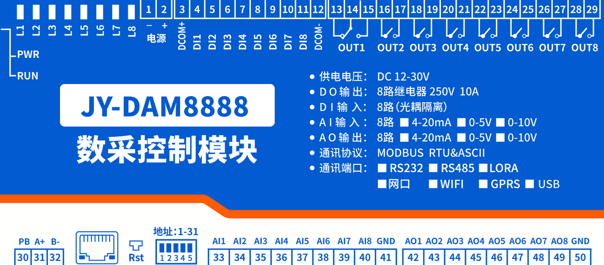 功能說明:12DO+8DI+8AI+4AO
