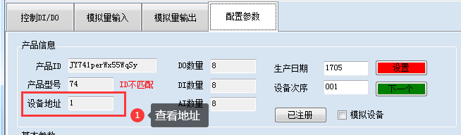 設備正常通訊后,初始設備地址寫入254,然后點擊軟件上方“配置參數”即可讀到設備的當前地址。