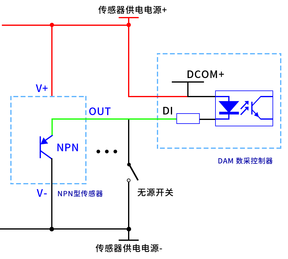 下圖中的電源部分為傳感器供電,AI1-AI8接傳感器信號正,ACOM-為傳感器信號負,ACOM+不用。